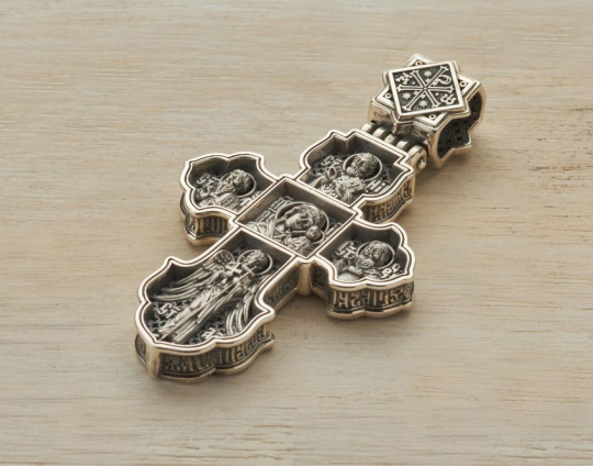 По бокам от Распятия - предстоящие Богородица и апостол Иоанн. Над верхней перекладиной находится Престол с образом Святого Духа в виде голубя. На ушке и обороте креста — иконы святых, к которым обращаются за помощью в бизнесе и торговле, при проблемах со здоровьем, учебой, в семейных неурядицах и многих других жизненных ситуациях.