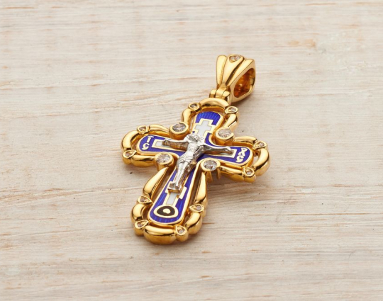 На лицевой стороне креста из серебра 925 пробы с позолотой и эмалью изображено Распятие. Вокруг него размещено 15 кристалла Swarovski. Линии, покрытые позолотой, вместе с ними создают эффект свечения, света, распространяющегося вокруг Христа. Синяя эмаль придает изделию яркости и художественно выделяет Распятие.