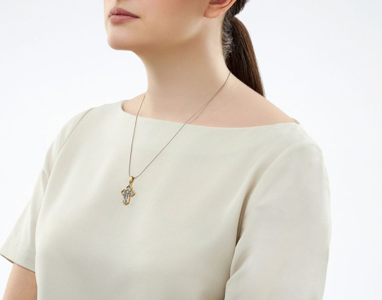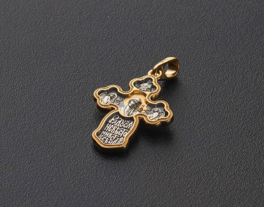 На лицевой стороне крестика из серебра 925 пробы с позолотой изображено Распятие с предстоящими в молитве Божьей Матерью и Иоанном Богословом. Над крестом находится голубь - символ Святого Духа. На фоне Распятия изображена стана града Иерусалима.