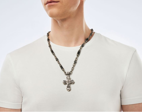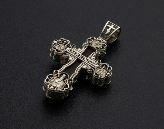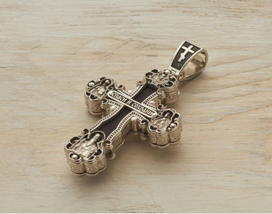 Серебряный крест выполнен на основе эбена. Сочетание дерева и серебра имеет символическое значение, особую значимость. Деревянная часть воспринимается как напоминание о Животворящем Кресте. Это как источник боли и страданий для Христа, так и спасение для любого верующего.