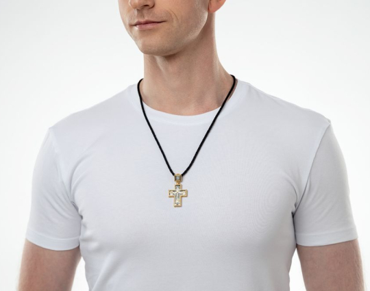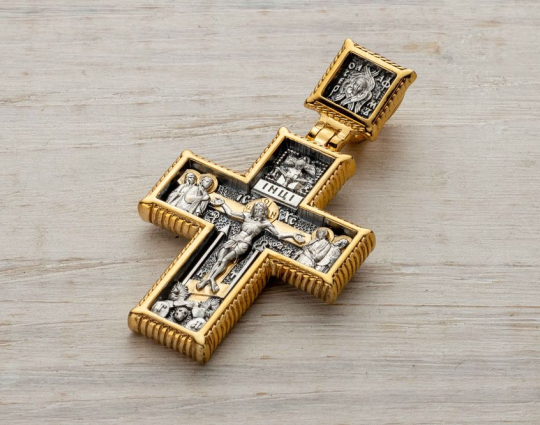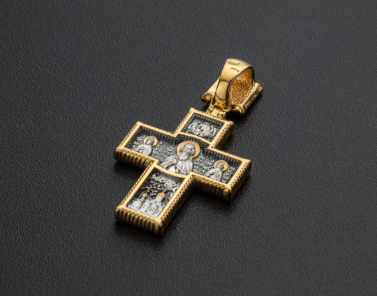 На лицевой стороне креста распятие Христово, на обороте св. Сергий Радонежский. Он родился в семье бояр с именем Варфоломей. Обучение довалось ему очень тяжело, пока не встретил старого священника и попросил молитв об одолении грамоты. После кончины родителей, Ворфоломей принял постриг с именем Сергий и взял благословение на пустынную жизнь. Он стойко выдерживал суровые погодные условия, нашествия диких зверей, молитвой отражал бесовские нападения. Преподобный стал родоначальником плеяды святых митрополитов, пользовался авторитетом у русских князей в периоды смуты, о чем свидетельствует визит Дмитрия Донского за благословением на битву. Сергий оставался равнодушен к материальным благам до самой смерти. Он отказался возглавить возникший монастырь и даже от кафедры митрополита.