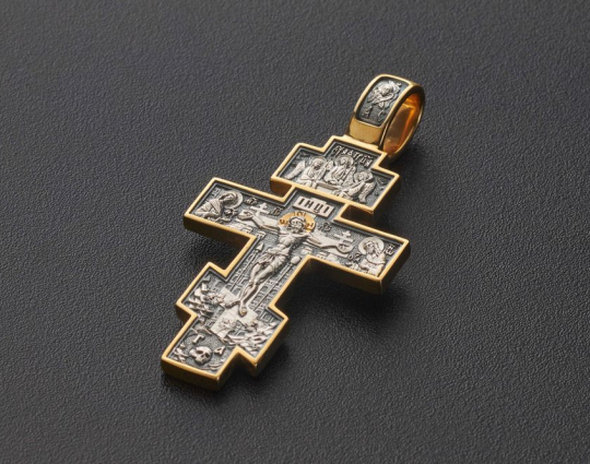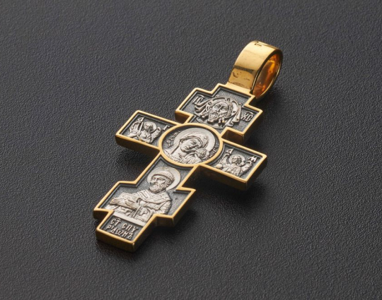 На лицевой стороне крестика из серебра 925 пробы изображено Распятие с предстоящими Девой Марией и Иоанном Предтечей. По традиции они изображены слегка согнутыми в молитве за людские души.