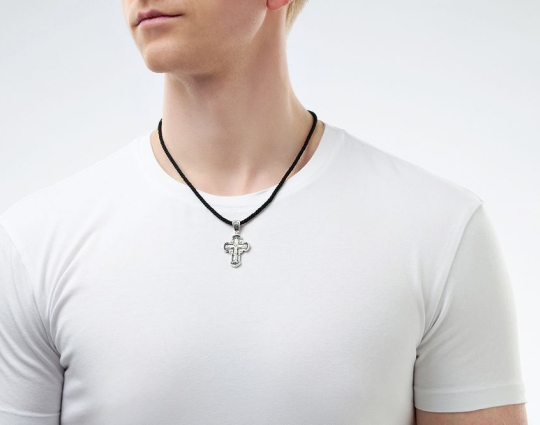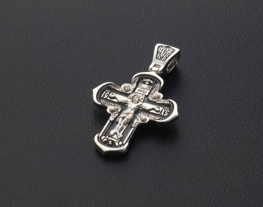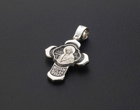 На лицевой стороне крестика из серебра 925 пробы изображено Распятие. На ушке находится надпись "Царь Славы". На обороте - образ Александра Невского, Святого защитника Руси, мудрого правителя, покровителя воинов, защитников Родины, солдат, оберегающих свой дом от врагов.