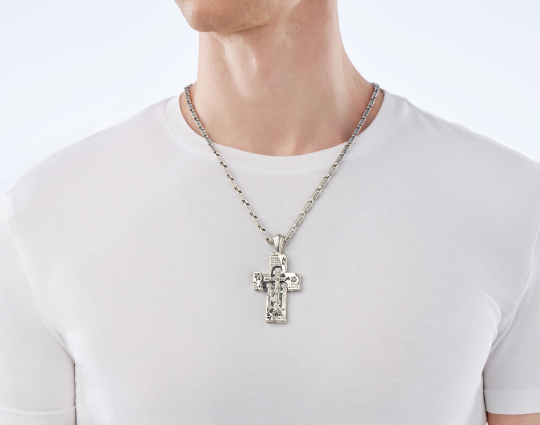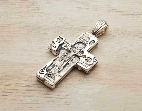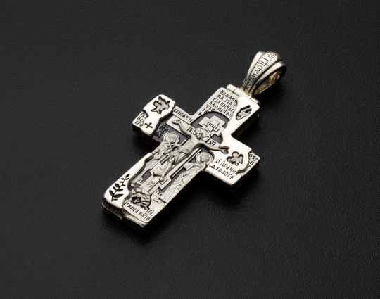 Православный крест из серебра выполнен в виде каменной кладки через которую пробивается распятие с предстоящими. По правую руку от Спасителя стоит Пресвятая Богородица, по левую - Иоанн Богослов. Справа и слева - преклоняющиеся ангелы.