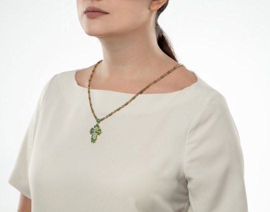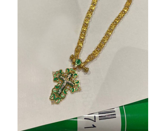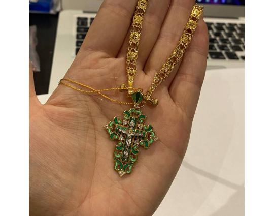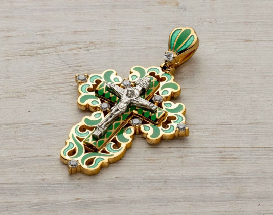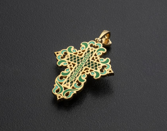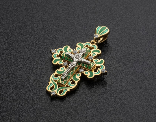 Нательный крестик из серебра 925 пробы с позолотой и камнями Swarovski. Изделие имеет изящное оформление в виде растительного узора. Яркости изделию добавляет позолота в сочетании с эмалью.  Визуально это выделяет распятие, подчеркивая значимость этого символа, той жертвы, которую принес Иисус для каждого человека.