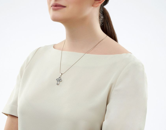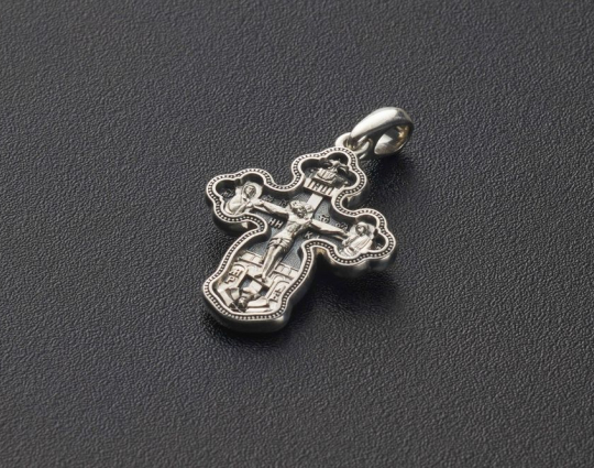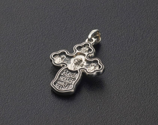 На лицевой стороне крестика из серебра 925 пробы с позолотой изображено Распятие с предстоящими в молитве Божьей Матерью и Иоанном Богословом. Над крестом находится голубь - символ Святого Духа. На фоне Распятия изображена стана града Иерусалима.