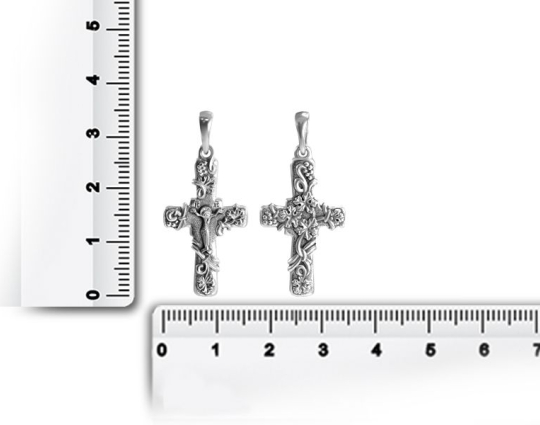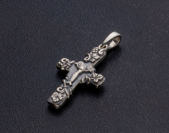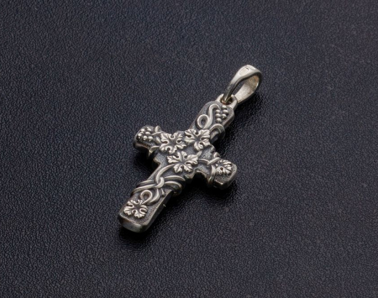 Серебряный крест с изображением Распятия Иисуса на лицевой стороне, которое огибает рельефный узор из виноградной лозы. Этот узор продолжается и на обратной стороне креста.