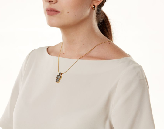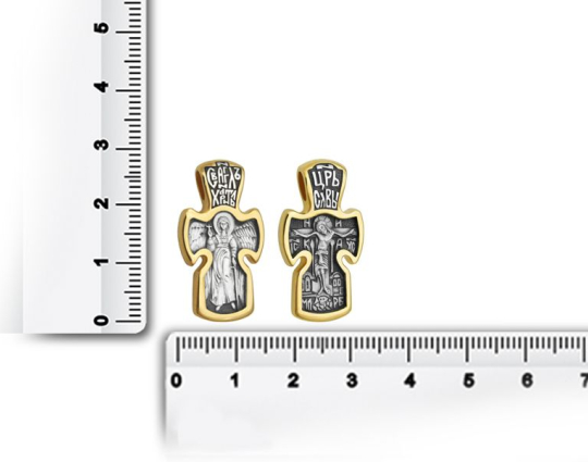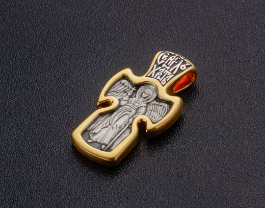 Серебряный крест с позолоченной отделкой, который имеет не совсем обычную форму для такого изделия. Она выбрана не случайно. На обратной стороне нарисован Ангел-Хранитель с распростертыми крыльями и форма креста выбрана так, чтобы его образ полностью вписался, потому что Ангел-Хранитель один из сильнейших защитников человека от злых духов, темных сил и просто жизненных неурядиц. Он приходит к каждому из нас при крещении, остается рядом всю жизнь и сопровождает душу после кончины.