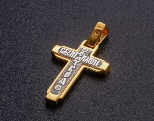 Серебряный крест с позолоченными элементами, который как бы состоит из двух скрепленных между собой частей. У этого изделия подвижное оглавие. Раньше так делали для тех крестов, которые хранили в себе частичку святыни.