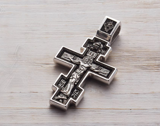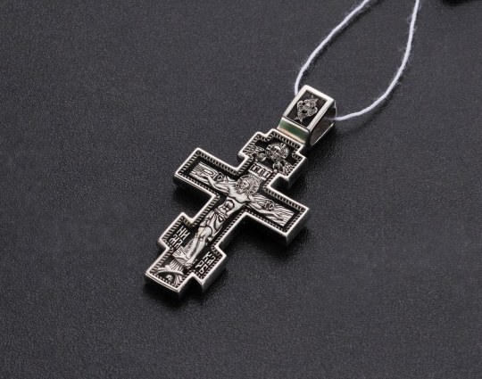Крест из серебра с изображением Распятия Христова на лицевой стороне. На обороте - икона Архангела Михаила, изображенного на темном фоне. Ему поклоняются как покровителю воинов и защитнику простых людей от темных сил и злых умыслов других людей.