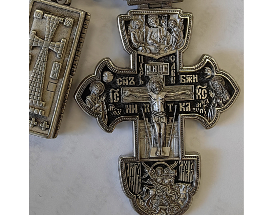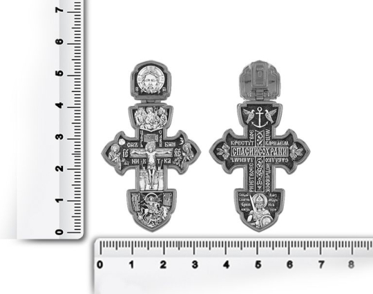 Серебряный крест в форме якоря. На лицевой части в центре изображено Распятие Христово. По бокам от него - склонившиеся в молитве фигуры: Богоматерь и Иоанн Предтечей. В верхней части креста нарисована Святая Троица. Внизу - образ Архангела Михаила. Он почитается как покровитель воинов и защитник простых людей от темных сил и злых умыслов других людей.