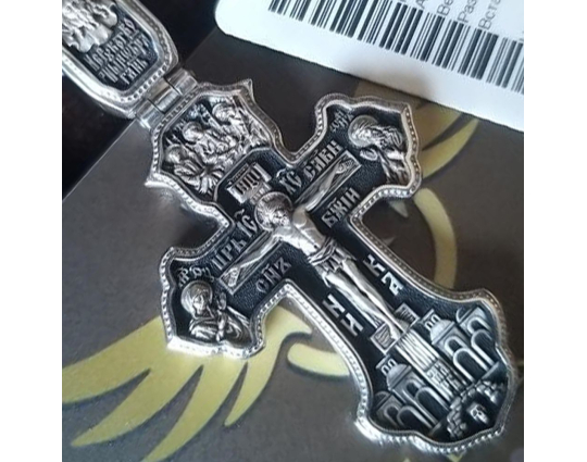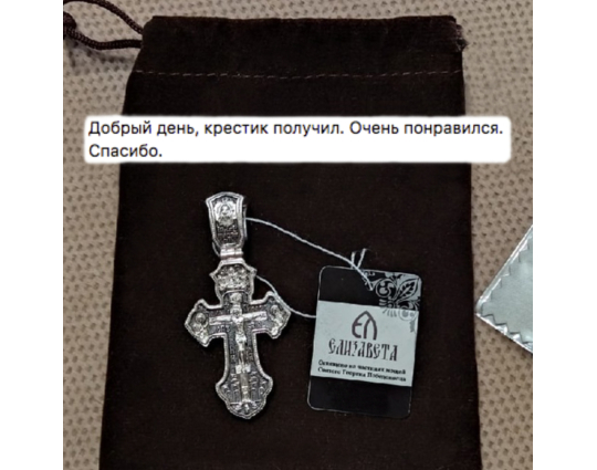 Серебряный крест с изящно вырезанным контуром. На лицевой части в центре изображено Распятие Христово. По бокам от него - склонившиеся в молитве фигуры: Богоматерь и Иоанн Предтечей. В верхней части креста нарисована Святая Троица.