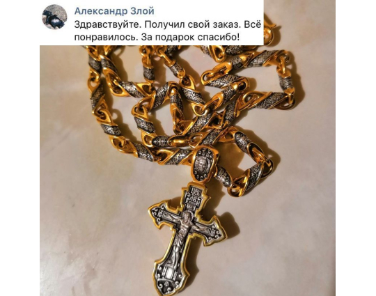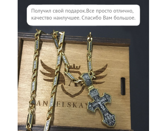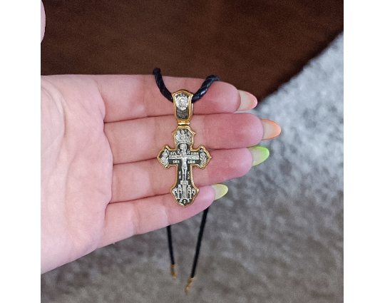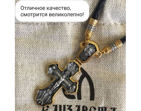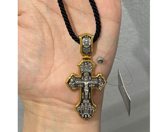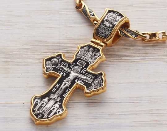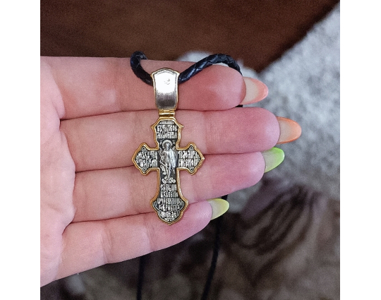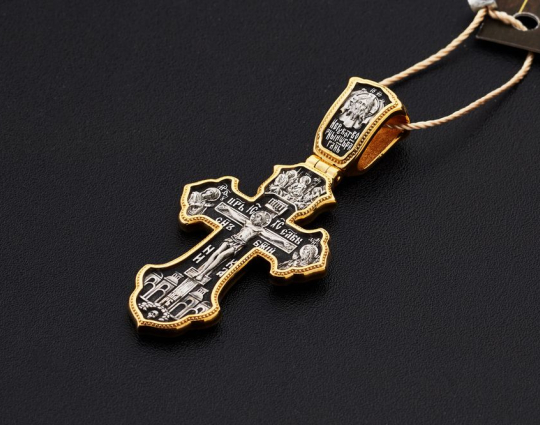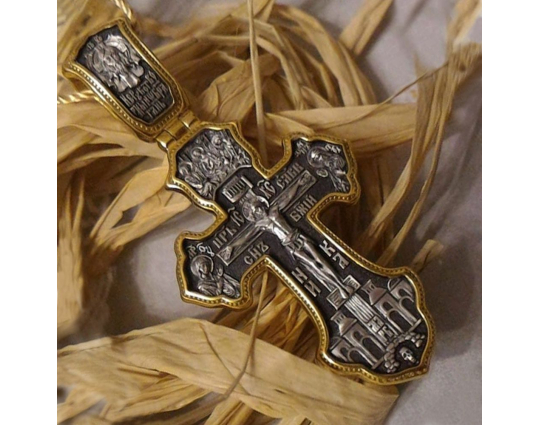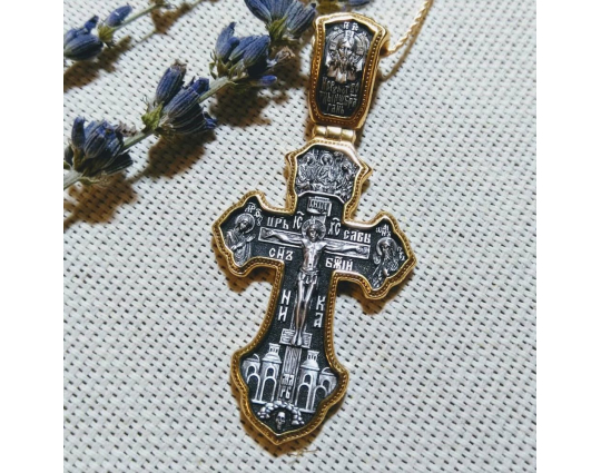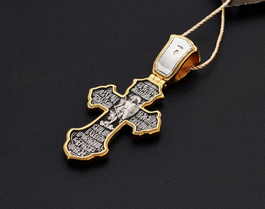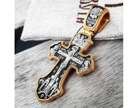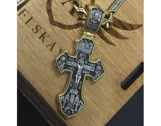 Крестик из серебра с позолоченным покрытием с изображением Распятия Христа на передней части. Сбоку от него стоят Пресвятая Богородица и Иоанн Предтеча, склонившие свои головы в прошении. Над Распятием помещена Святая Троица.