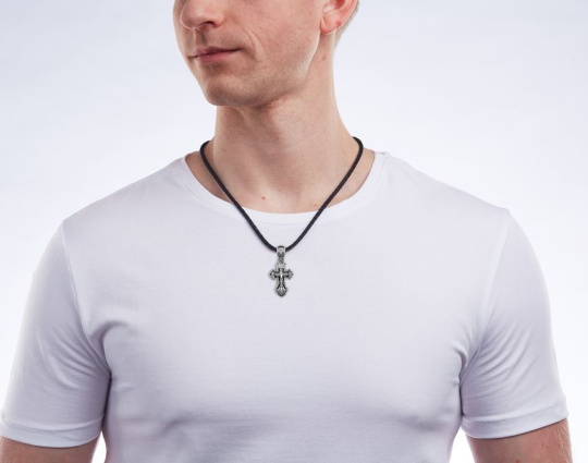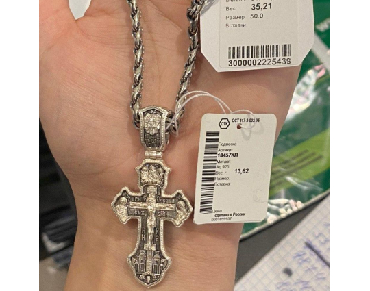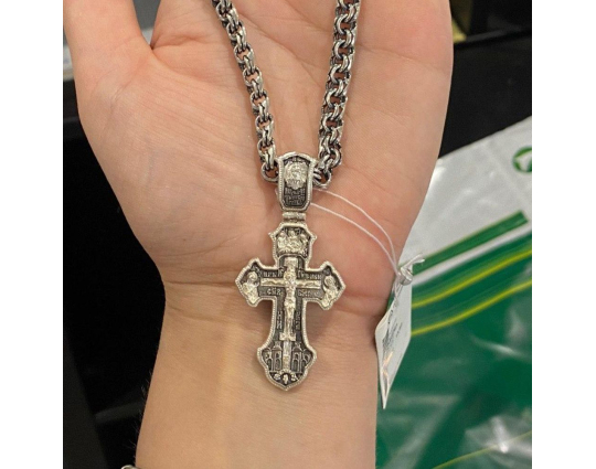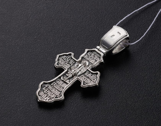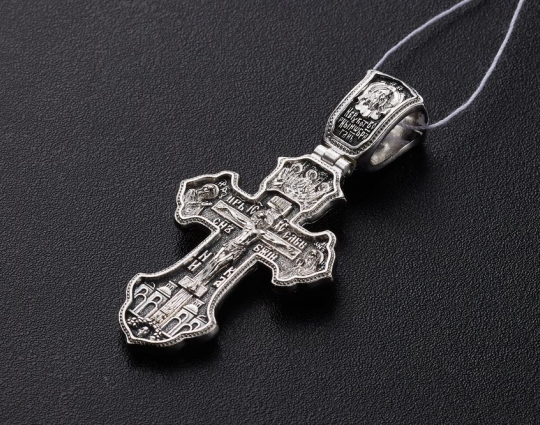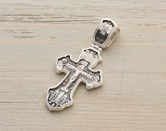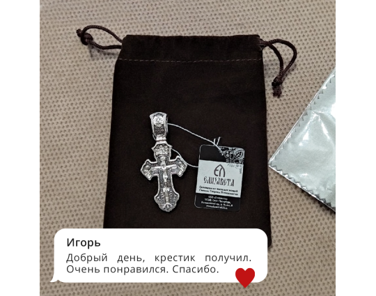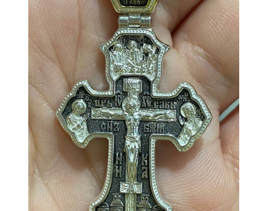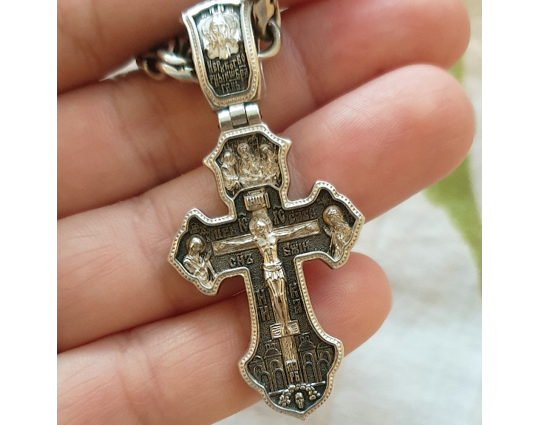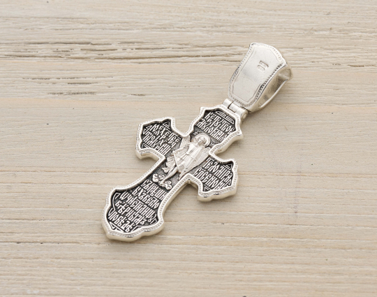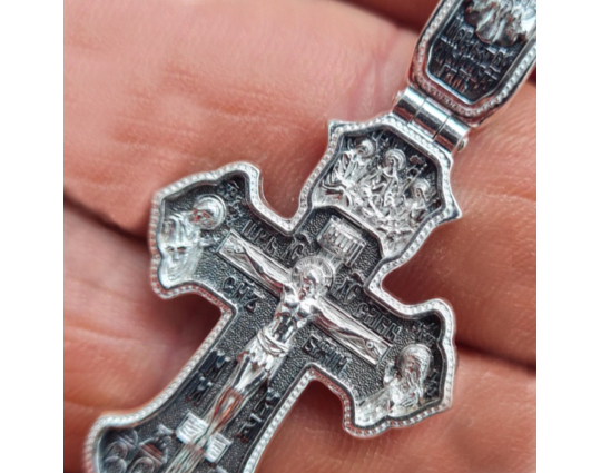 Крестик из серебра с Распятием Христа на передней части. Сбоку от него стоят Пресвятая Богородица и Иоанн Предтеча, склонившие свои головы в прошении. Над Распятием помещена Святая Троица.