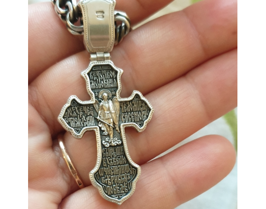 Вокруг Архангела начертаны начальные слова из молитвы Животворящему Кресту - «Кресту Твоему поклоняемся, Христе, честному хранителю мира, спасению нас, грешных, велию очистилищу, верным победе».