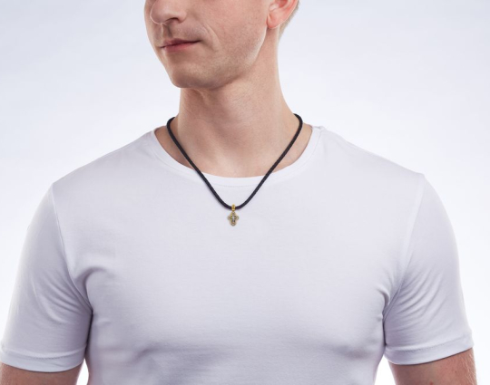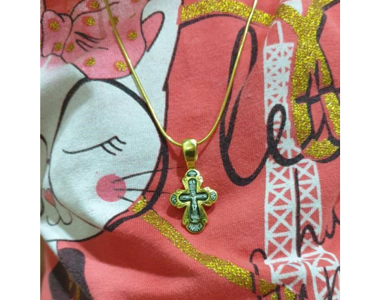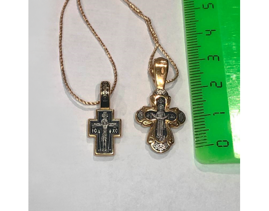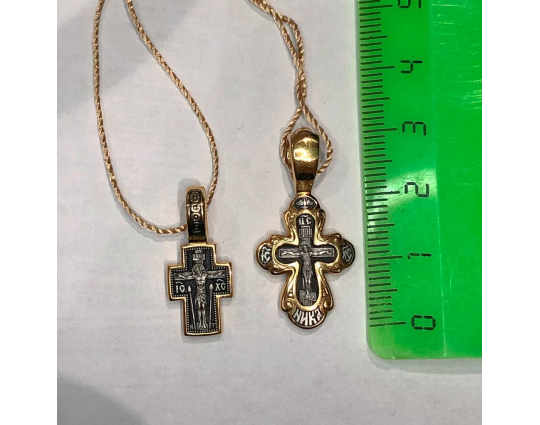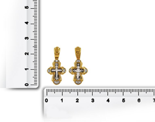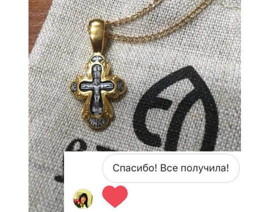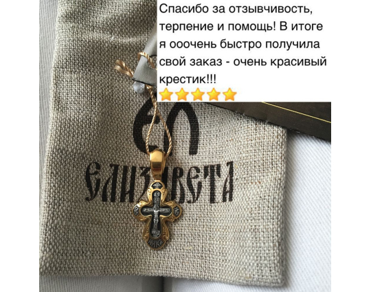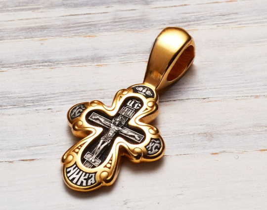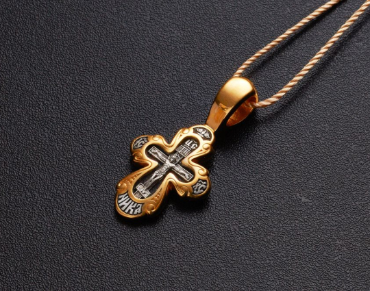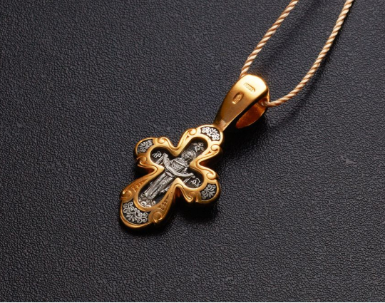 Серебряный крест округлой формы, которая напоминает собой распустившийся цветок, что является символом того, что Крест-это не только боль и страдания, но жизнь, ведь Христос победил смерть. На лицевой стороне креста изображено Распятие Иисуса. Оно нанесено на затемненный фон, чтобы усилить духовную значимость этой библейской сцены.