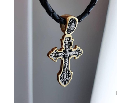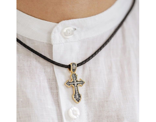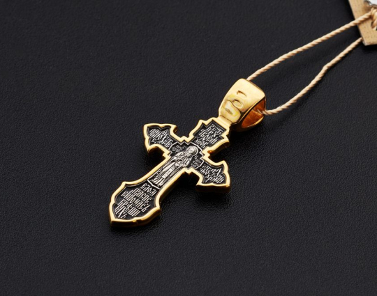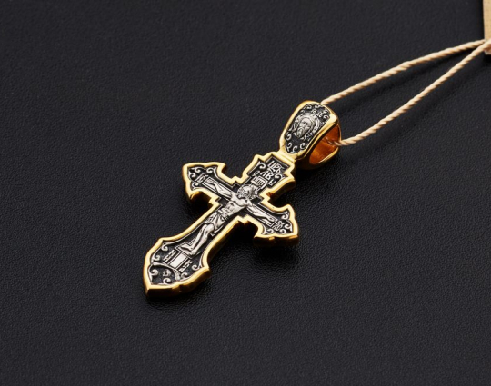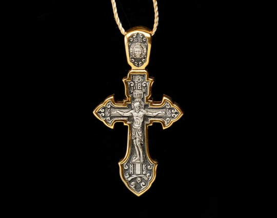 Крестик из серебра с позолоченной отделкой и изящно вырезанным контуром. На лицевой стороне - изображение Распятия Христа.