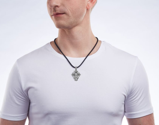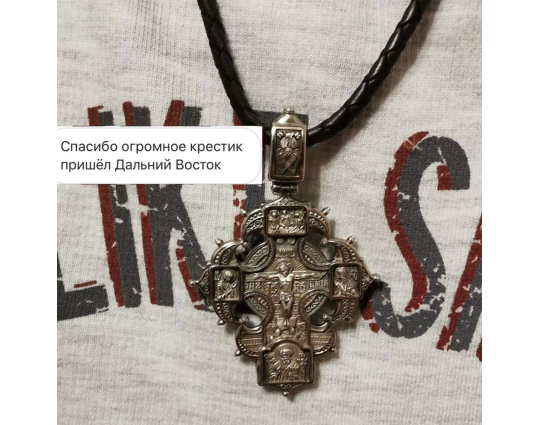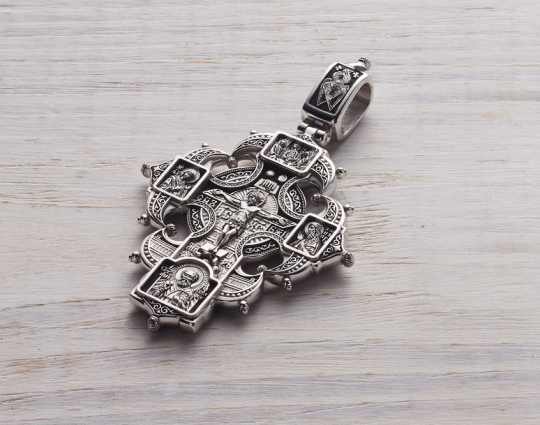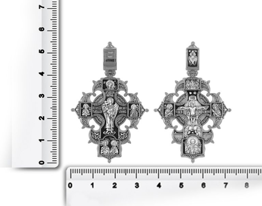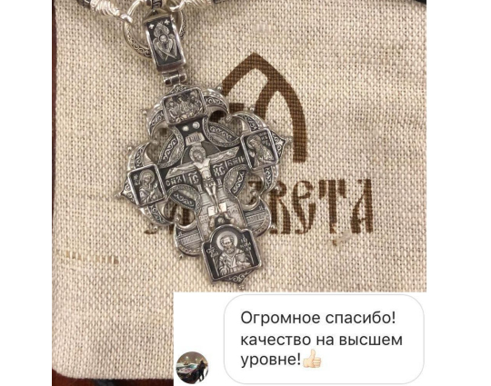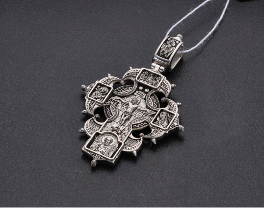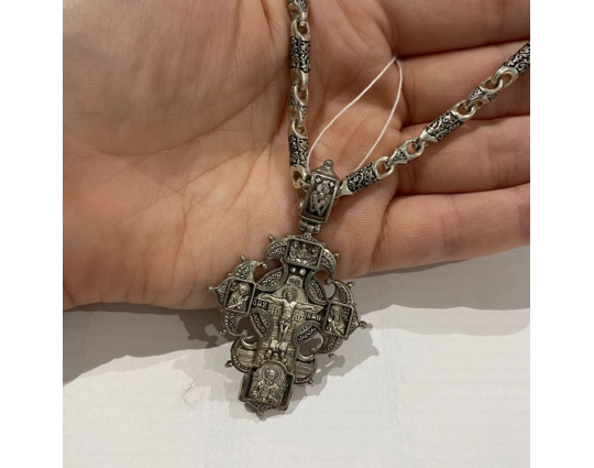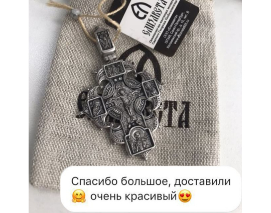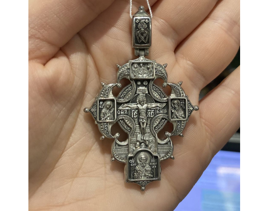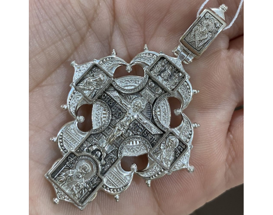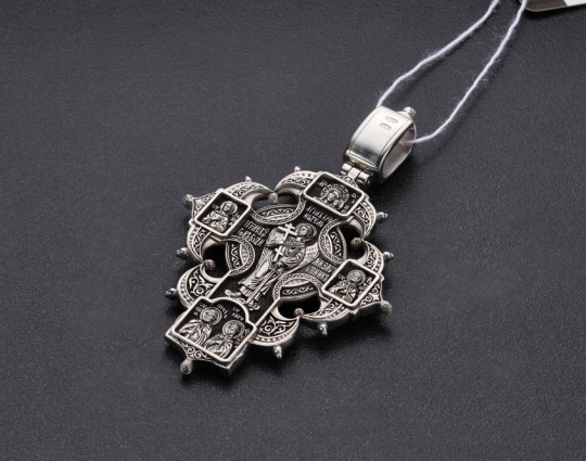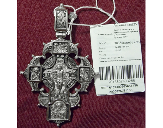 Серебряный крест необычной формы, на лицевой части которого, в центре изображено Распятие Христово. По бокам от него - склонившиеся в молитве фигуры: Богоматерь и Иоанн Предтечей. В верхней части креста нарисована Святая Троица. Внизу - образ Николая Чудотворца. Его почитают как защитника путешественников в долгой дороге, просят у него исцеления от болезней и помощи в семейных делах.