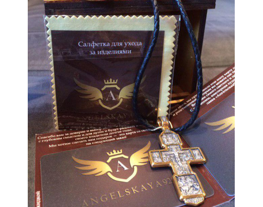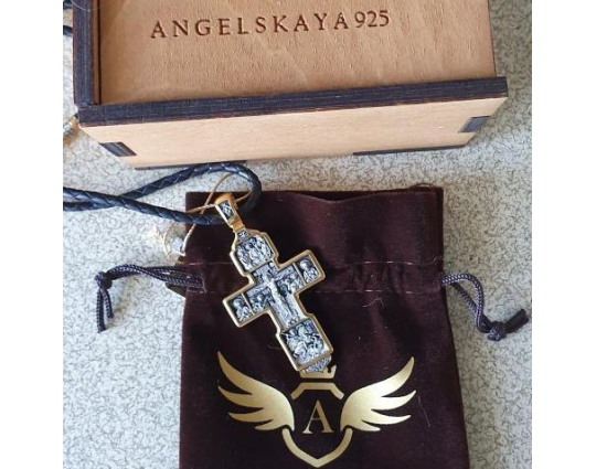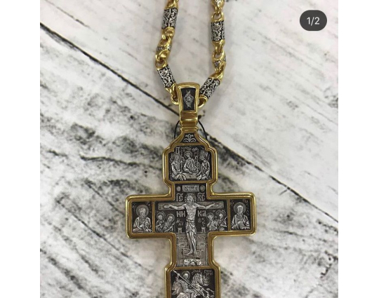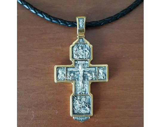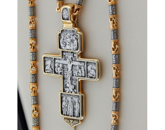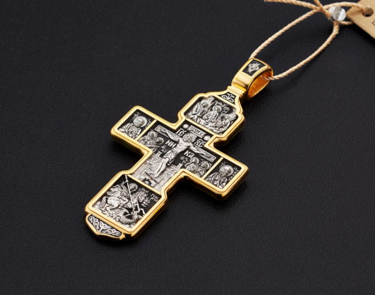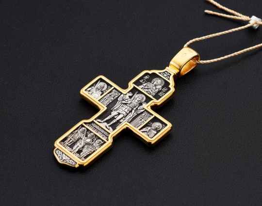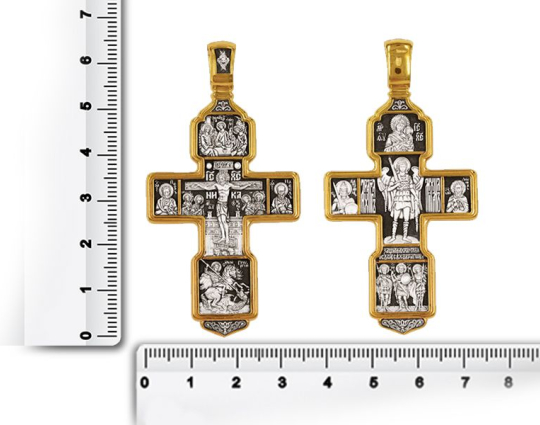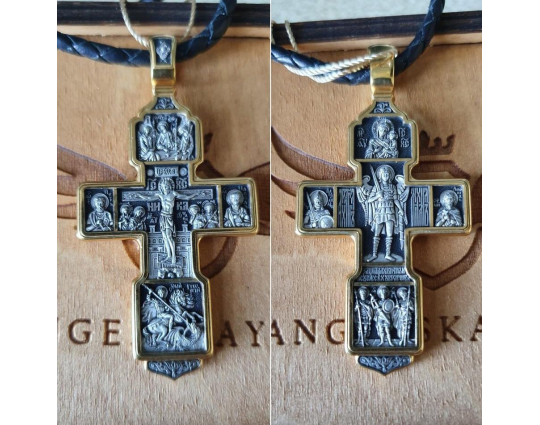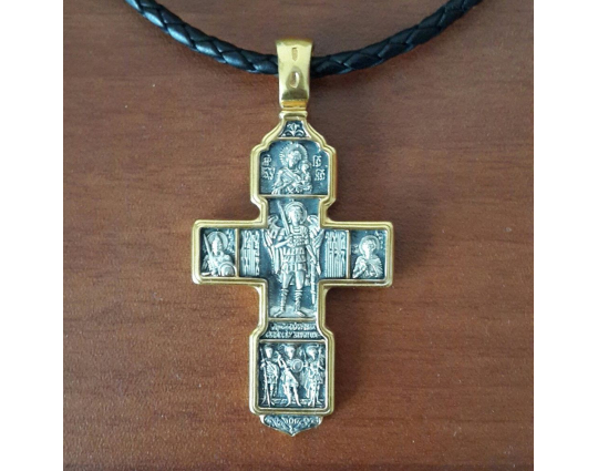 Крест из серебра, на лицевой части которого расположено Распятие Христа и образы тех Святых, по преданию находящихся рядом с ним в тот момент. По бокам от Распятия нанесены образы апостолов Павла и Петра. Вверху - икона Святой Троицы. Внизу - Георгий Победоносец во время своего великого подвига: победы над змием, который символизирует дьявола. Святой Георгий покровительствует воинам, защищает простых людей в опасности.