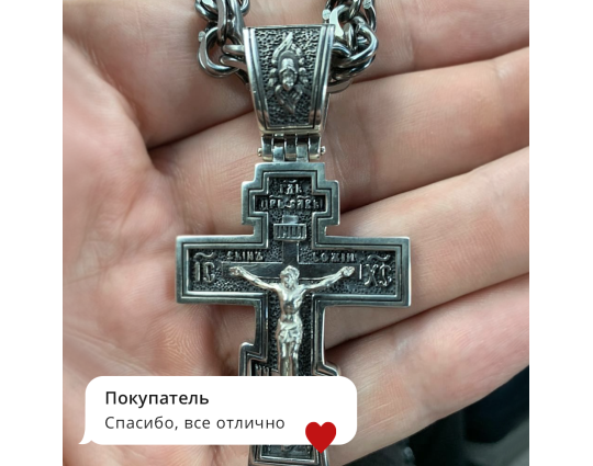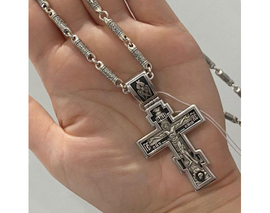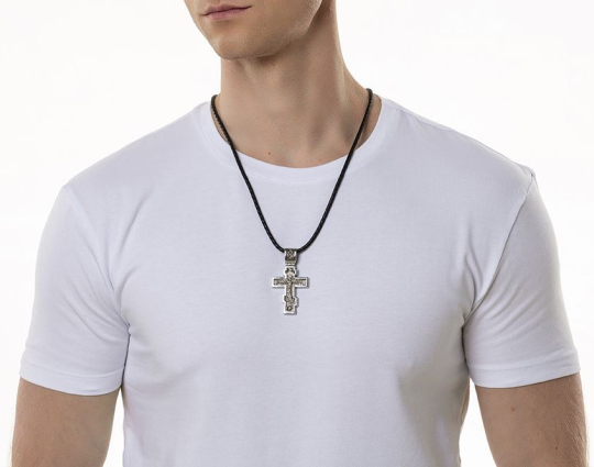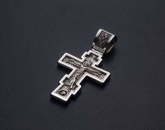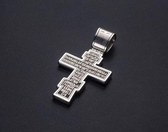 Православный нательный серебряный крест с изображением Распятия Христова на лицевой стороне и оградительной молитвой на обороте. С этими словами к Богу обращаются в опасных жизненных ситуациях и для защиты от злых духов.