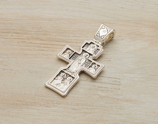 На обратной стороне в центре изображен Святой Князь Владимир. Он был мудрым правителем, сделавшим очень многое для распространения христианства. К нему обращаются за мудростью, при болезнях глаз и духовной слепоте, для укрепления веры. Образ помогает в решении не только личных, но и глобальных проблем.