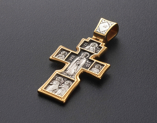 На обратной стороне в центре изображен Святой Князь Владимир. Он был мудрым правителем, сделавшим очень многое для распространения христианства. К нему обращаются за мудростью, при болезнях глаз и духовной слепоте, для укрепления веры. Образ помогает в решении не только личных, но и глобальных проблем.