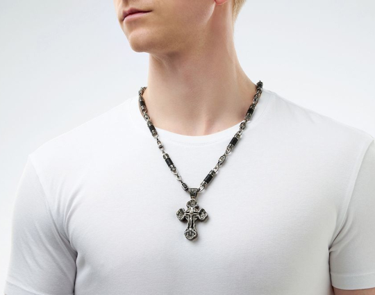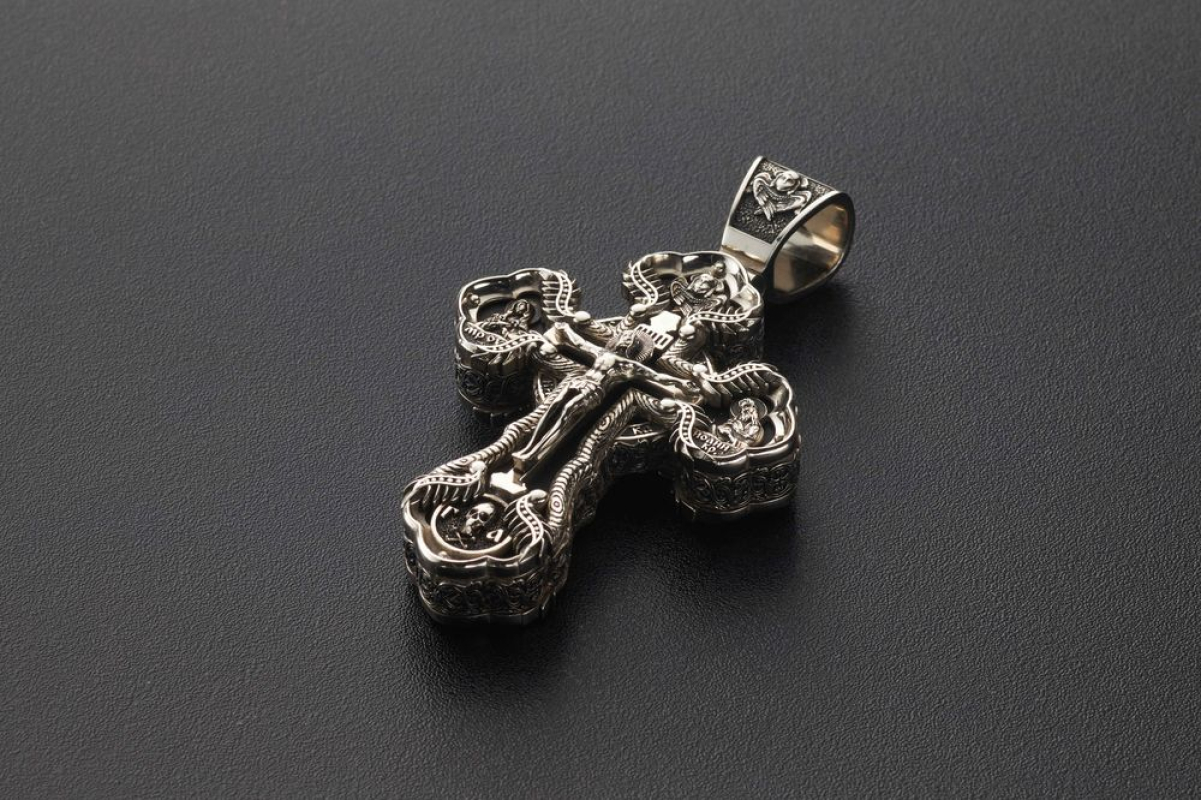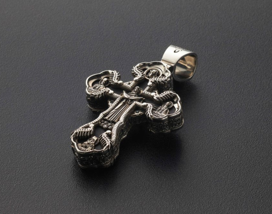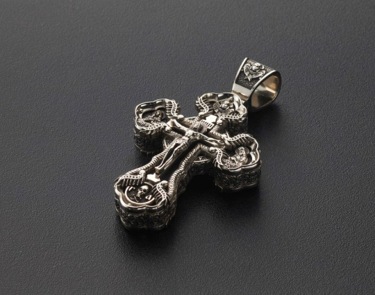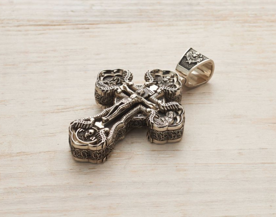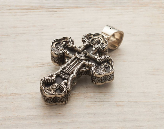 Серебряный крест выполнен на основе эбена. Сочетание дерева и серебра имеет символическое значение, особую значимость. Деревянная часть воспринимается как напоминание о Животворящем Кресте. Это как источник боли и страданий для Христа, так и спасение для любого верующего.