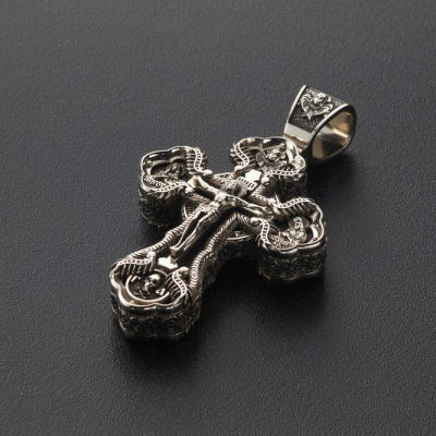 Над распятием изображен ангел. На обратной стороне на ушке находится надпись "Царь Славы". По центру написано "Спаси и Сохрани". Вставка с растительным орнаментом выполнена из серебра.