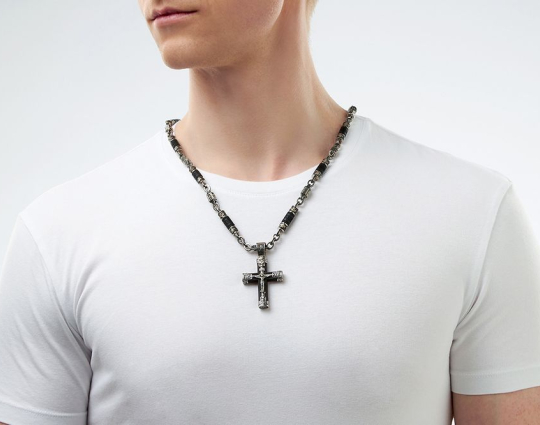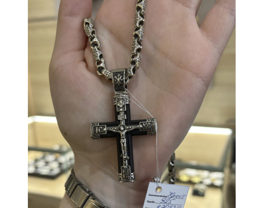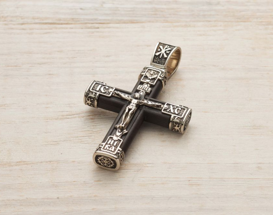 Серебряный крест выполнен на основе эбена. Сочетание дерева и серебра имеет символическое значение, особую значимость. Деревянная часть воспринимается как напоминание о Животворящем Кресте. Это как источник боли и страданий для Христа, так и спасение для любого верующего.