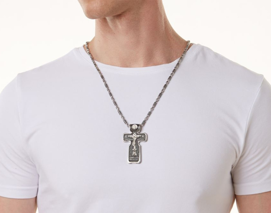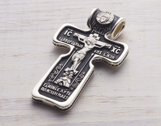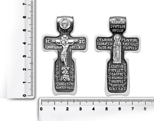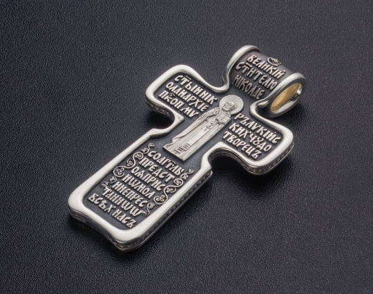 Изящный серебряный крест с затемненным фоном и светлой отполированной окантовкой. Внутри креста – изображение Николая Чудотворца,  одного из самых почитаемых Святых на Руси. У него просят помощи в пути, в сложных жизненных ситуациях, при исцелении болезней.