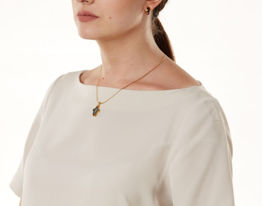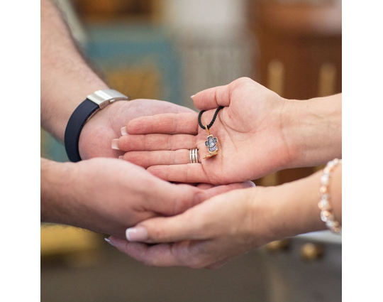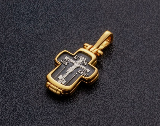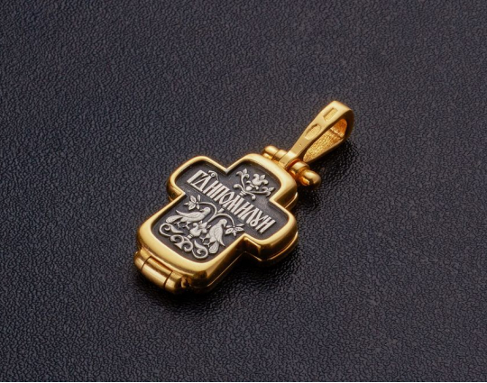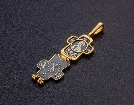 Небольшой серебряный с позолоченной отделкой крест - складень с изображением на лицевой стороне Распятия Иисуса Христа.  Внутрь помещен образ Николая Святителя и Хризма. Это древнейший знак Христа. Она складывается из двух первых букв его имени на греческом языке. Николай Чудотворец - самый почитаемый святой на русской земле. К нему обращаются за помощью в путешествиях, за покровительством воинов и за содействием при решении семейных дел.