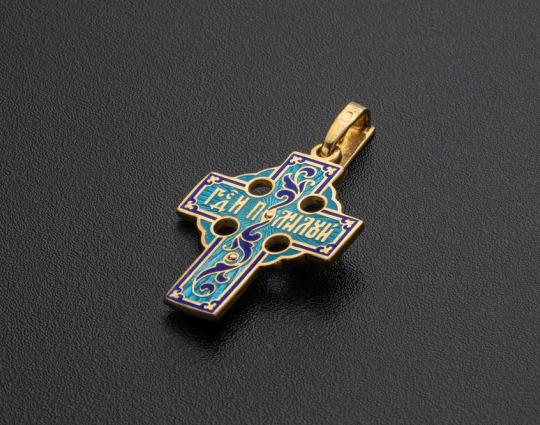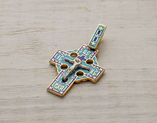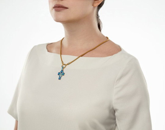 Эмаль часто использовалась в церковном прикладном искусстве. Каждый цвет имеет свое значение. На этом крестике использованы те цвета и оттенки, которые имеют отношение к теплу, мудрости, чистоте и целомудрию. Это цвета небес.