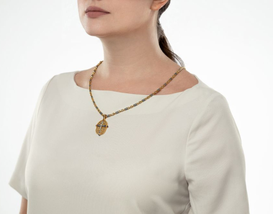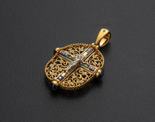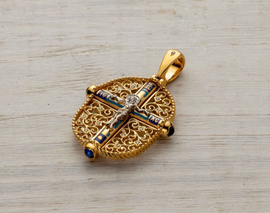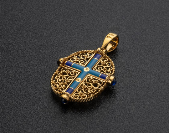 Сочетание эмали голубого и синего цвета и позолоты на этом крестике создает яркий эффект, который дополняется растительным орнаментом и драгоценными камнями - 13 кристаллами и 3 сапфирами Swarovski.