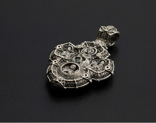Крест «Агора», что в переводе означает «собрание», представляет собой настоящее собрание святых, символических орнаментов и драгоценных камней. Его широкая четырехлопастная форма в полной мере дает возможность раскрыться красоте сложного узора, подчеркнутого сиянием одиннадцати камней.