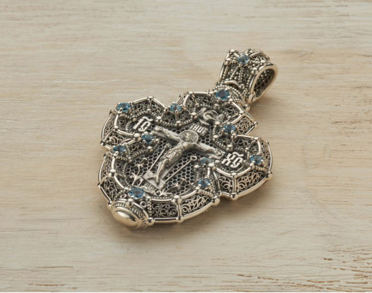 Православный крест из серебра 925 пробы. На лицевой стороне изображено Распятие, окруженное растительным орнаментом и топазами.