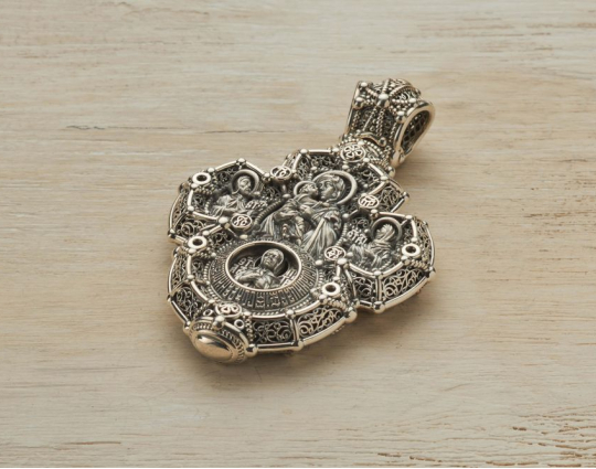 Внизу оборота креста, в круге — образ святой блаженной Матроны Московской, помощницы для православных людей и в личной жизни, и в бизнесе. Вокруг начертана оградительная молитва: «О святая угодница Божия, сохрани мя от всякого зла».