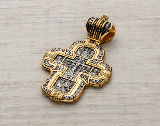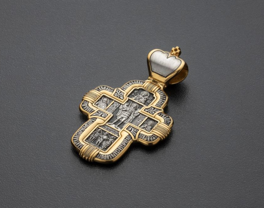 Ушко крестика выполнено в виде короны, символизируя, что Христос - царь всех людей, ведущий в праведников в свое царство. На навершии размещен фианит.