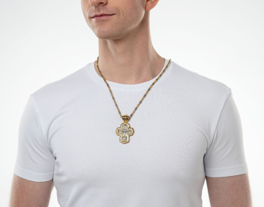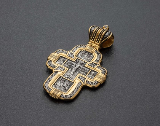 По бокам от Распятия на этом крестике из серебра 925 пробы изображены Святые Пётр и Павел. Они помогают пережить недуги, душевных и физические страдания. К ним обращаются за помощью в любых благих и богоугодных начинаниях, ведь они много сделали для распространения Христианской веры.