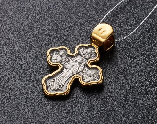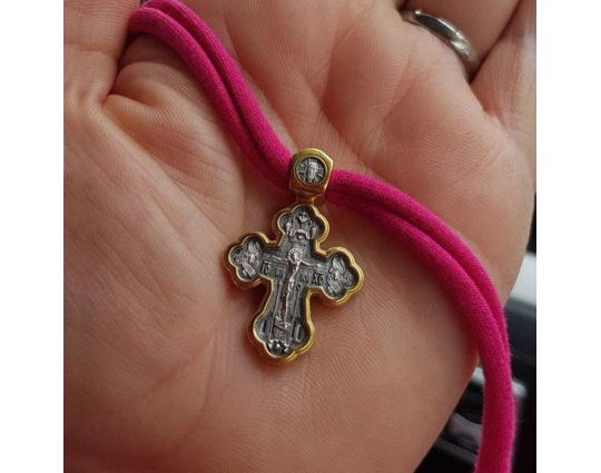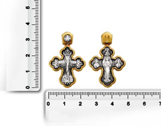 Серебряный крест необычной формы с позолоченной отделкой. На лицевой стороне - Распятие Христа. На обороте, центре - Архангел Рафаил. Он был великим русским врачевателем. Он был даже выше всех остальных архангелов и ближе всех к Богу.