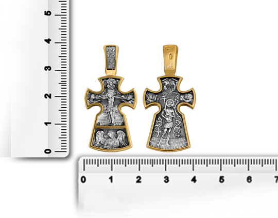 Именно поэтому лицевая часть этого изделия украшена Распятием Иисуса. Он погиб за людей, принимая на себя их грех. Совладать с темной греховностью этого мира ему помогал Архангел Михаил. Он связал сатану, положив конец его безграничному правлению над миром. Образ этого Архангела помещен в нижней части креста.