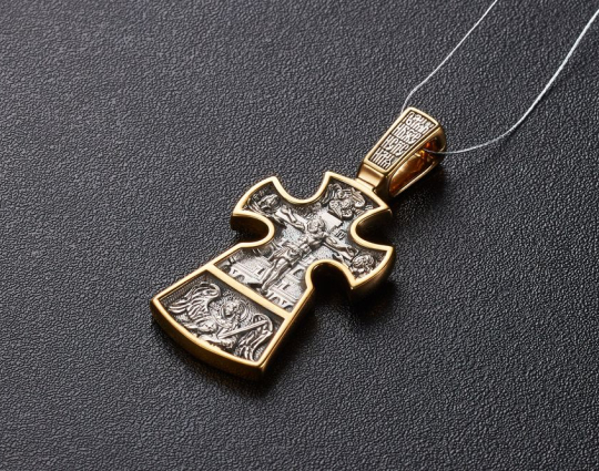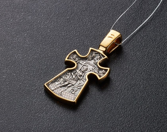 Массивный серебряный крест с позолоченной отделкой, который полностью посвящен учению Православной церкви о спасении, заключающее в себе как Божественную часть, так и человеческую.