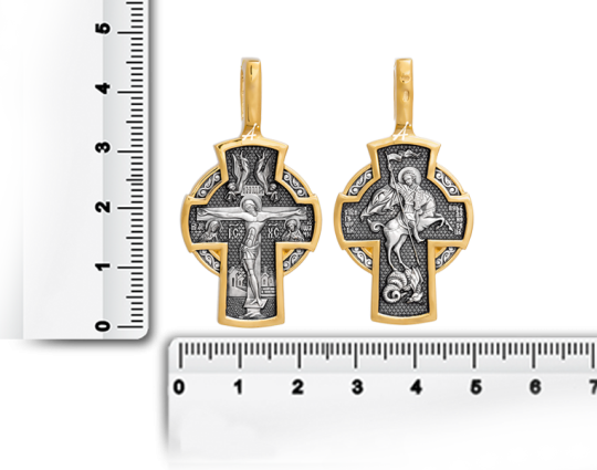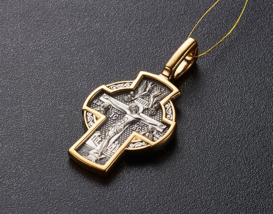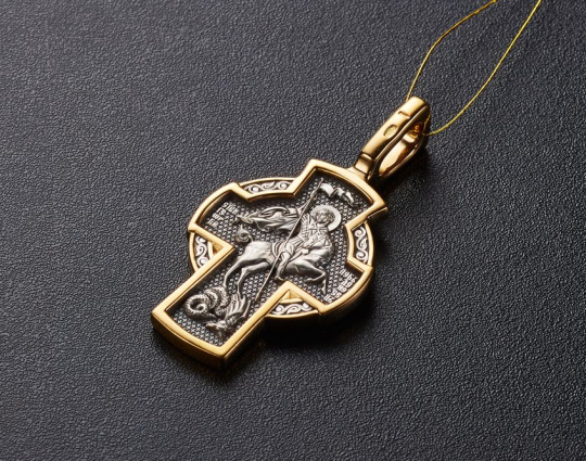 Массивный серебряный крест, напоминающий по своей форме древние «поклонные кресты», которые ставились у дорог, возле деревень, чтобы путешественник мог отдать свою дань уважения Богу. На лицевой стороне традиционно изображено Распятие Христа. Распятие Христово является символом христианства и олицетворяет победу над злом и смертью. Над Распятием изображены летящие вниз с Небес Ангелы.