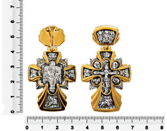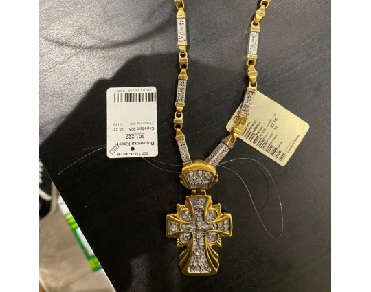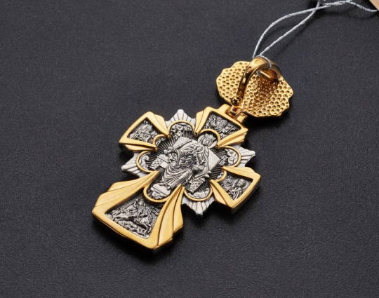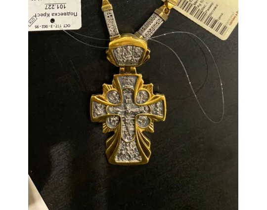 Серебряный четырехконечный крест с позолоченной изящной отделкой в виде расходящихся лучей.