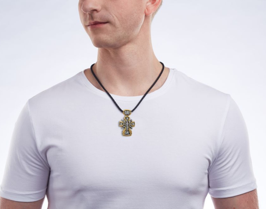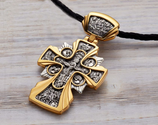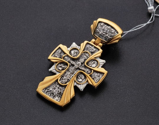 На лицевой стороне в центре креста изображено Распятие Христа на фоне прекрасного города Иерусалима. Распятие Христово является символом христианства и олицетворяет победу над злом и смертью. Окружают Иисуса русские святые: Глеб и Борис, Александр Невский и Дмитрий Донской.