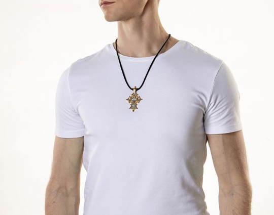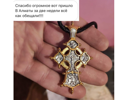 части креста позолоченный круг, на который нанесены слова молитвы.