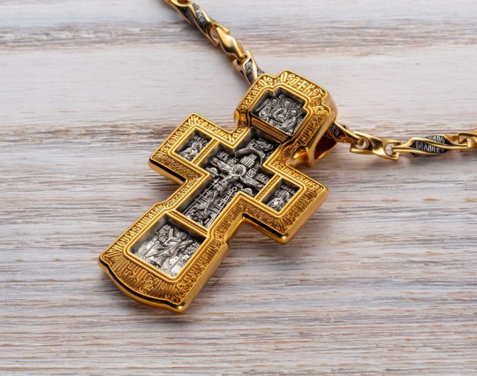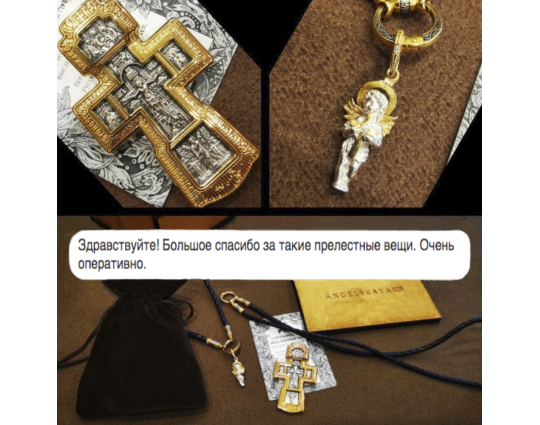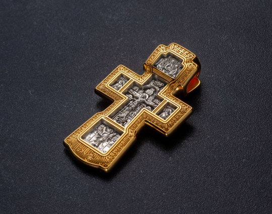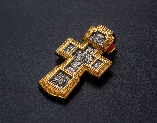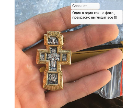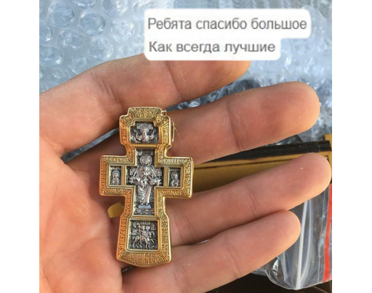 серебряный крест с позолоченной отделкой. По контуру с лицевой стороны написаны
