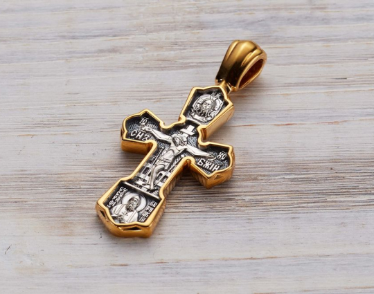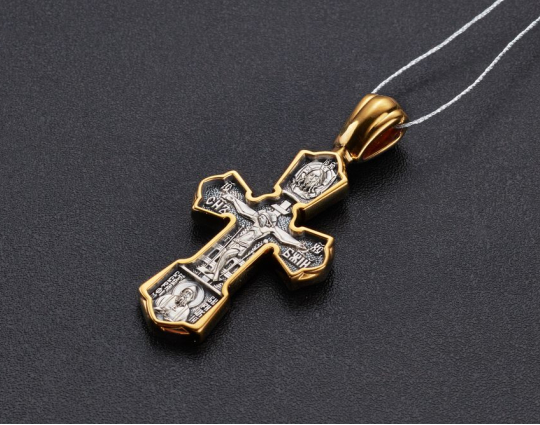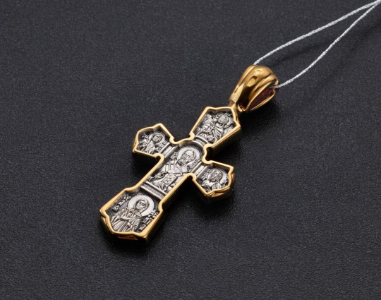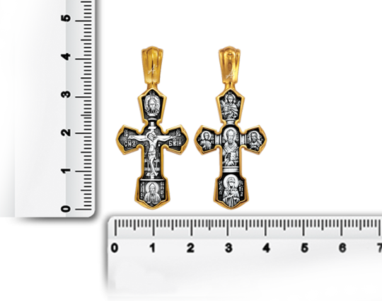 Крест из серебра с позолоченной отделкой, на лицевой стороне которого, традиционно нарисовано Распятие Иисуса. Его дополняют Святые, которые почитаются на Руси как чудотворцы, целители и покровители всего народа. Внизу, под Распятием - это образ Серафима Вырицкого.
