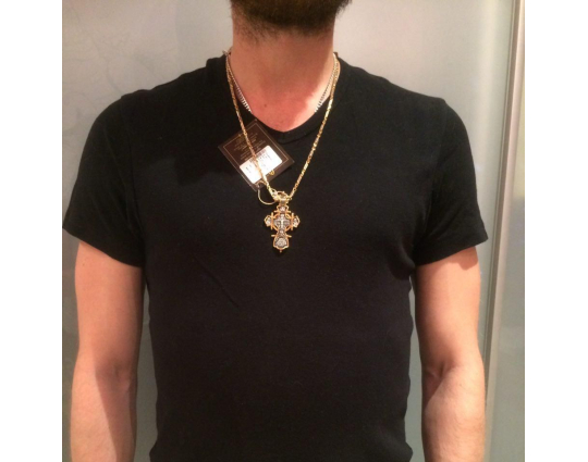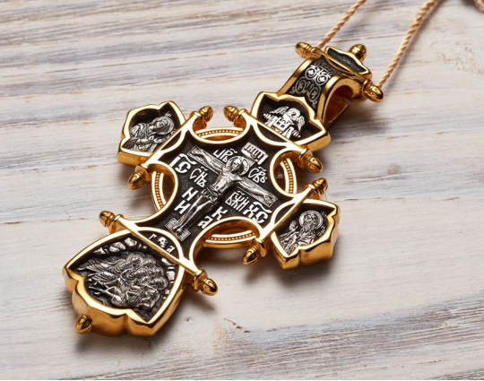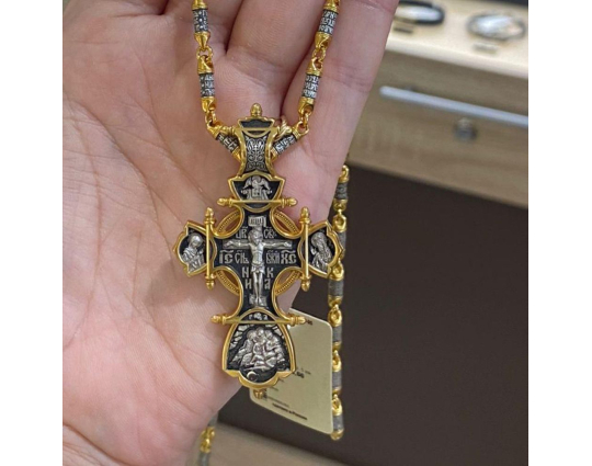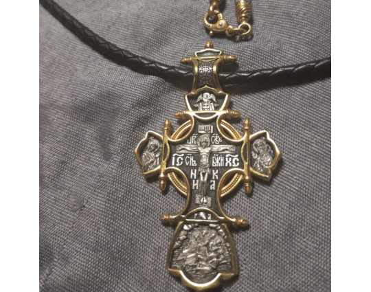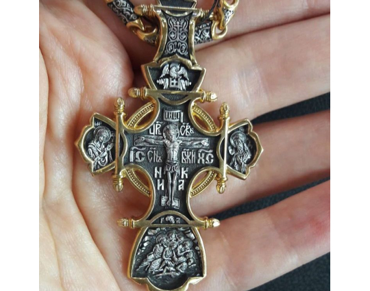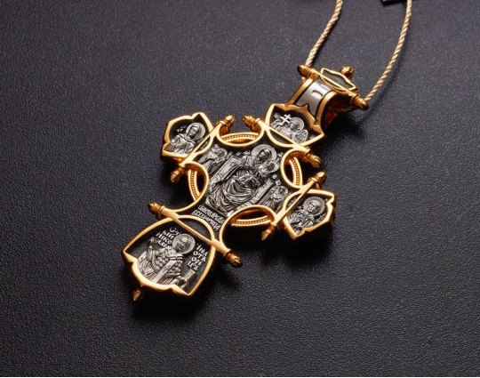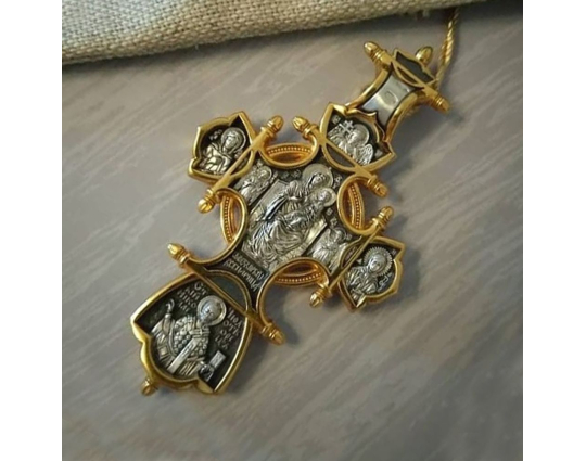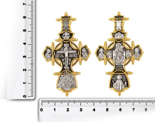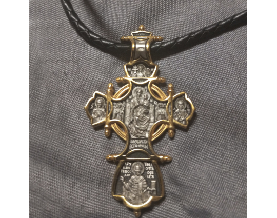 Крестик из серебра с изящной позолоченной отделкой. На лицевой стороне- изображение Распятия Христа. Сбоку от него стоят Пресвятая Богородица и Иоанн Предтеча, склонившие свои головы в прошении. Под ними расположена икона Семи отроков Эффеских, которые признаны мучениками христианскими.