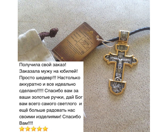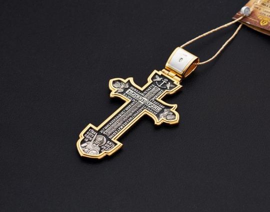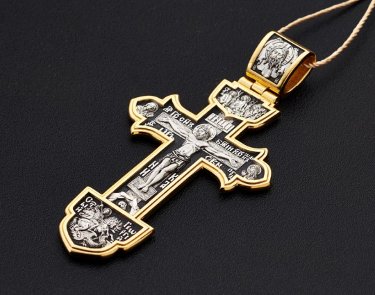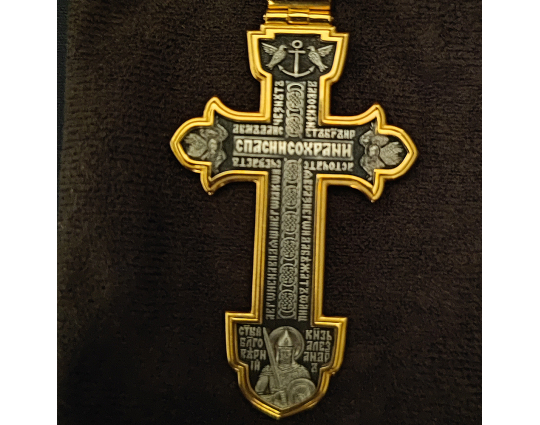 Крест из серебра с позолоченной отделкой и изображением Распятия Христа на лицевой части. Сбоку от него стоят Пресвятая Богородица и Иоанн Предтеча, склонившие свои головы в прошении. Над ними - икона Святой троицы. Внизу - образ Георгия Победоносца.