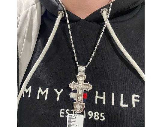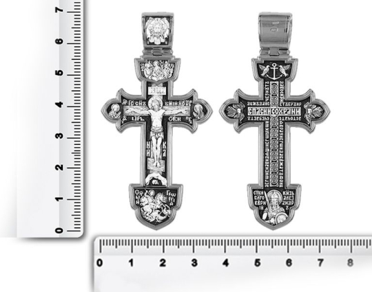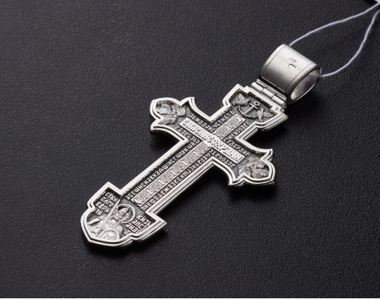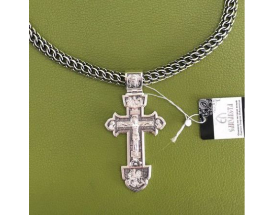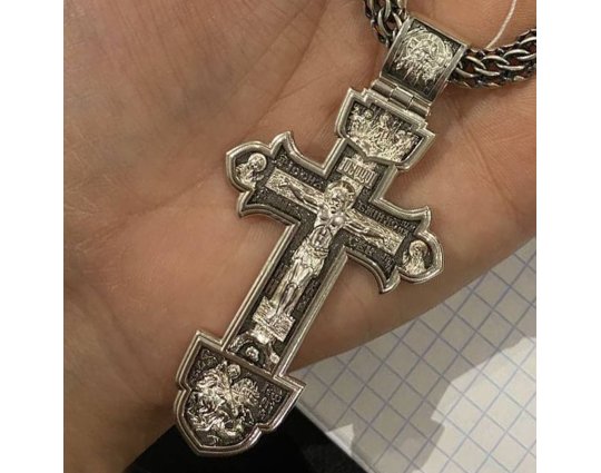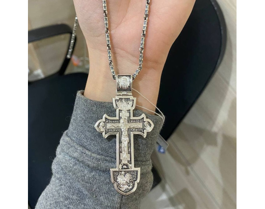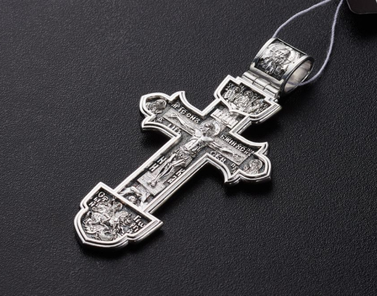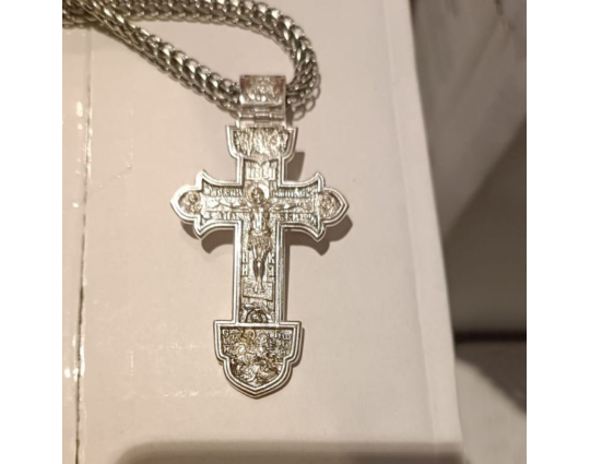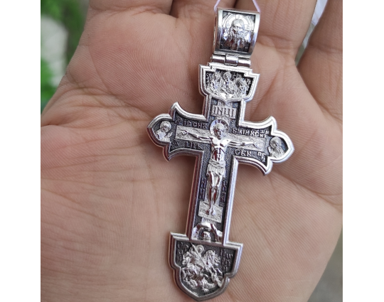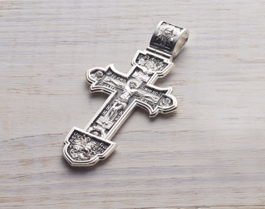 Крест из серебра с Распятием Христа на лицевой части. Сбоку от него стоят Пресвятая Богородица и Иоанн Предтеча, склонившие свои головы в прошении. Над ними - икона Святой троицы. Внизу - образ Георгия Победоносца.